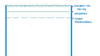 ORLO PER JEANS: è importante ricordare come ho già accennato di lavare i pantaloni prima di eseguire l'orlo altrimenti possono restringersi di alcuni cm. Indossare i pantaloni, prendere la misura all'altezza desiderata solitamente ad 1 cm dal tacco della scarpa e fermare la piega con due spilli formano una croce, in modo tale che sfilando i pantaloni non si perda il segno. Stirare i pantaloni, stendere le gambe dei pantaloni l'uno sul'altra, riportando la misura desiderata aiutandosi con una riga, segnare con il gessetto per tutta la larghezza dell'orlo, ed imbastire (fig. 1)sia su una gamba che sull'altra. Tagliare la stoffa in eccesso lasciando 3 o 4 cm di margine (fig. 2). Rifinire il margine con lo zig zag a macchina (fig. 3), piegare su se stesso due volte il margine fino a riportarlo al segno dell'imbastitura fermando con degli spilli, imbastire, passare a macchina con il punto diritto (fig. 4). Togliere i fili di imbastiture ed infine stirare l'orlo ottenuto.